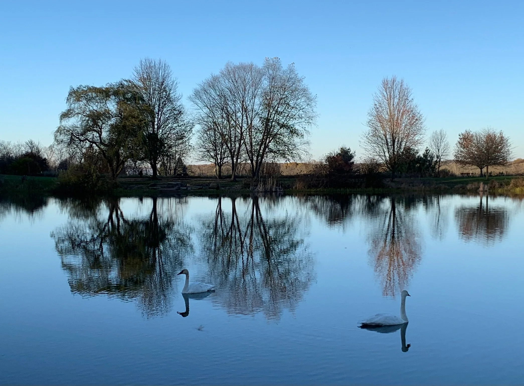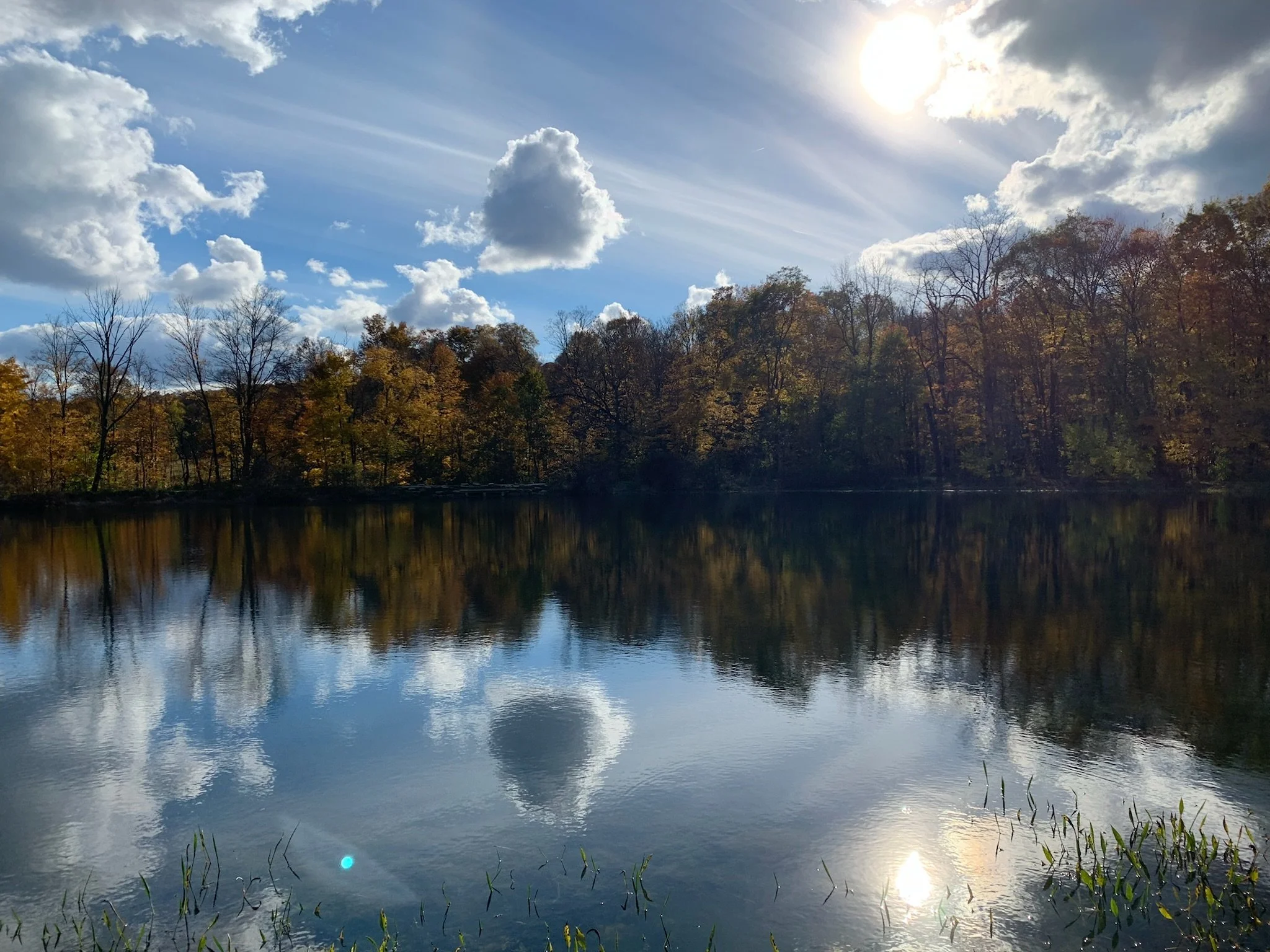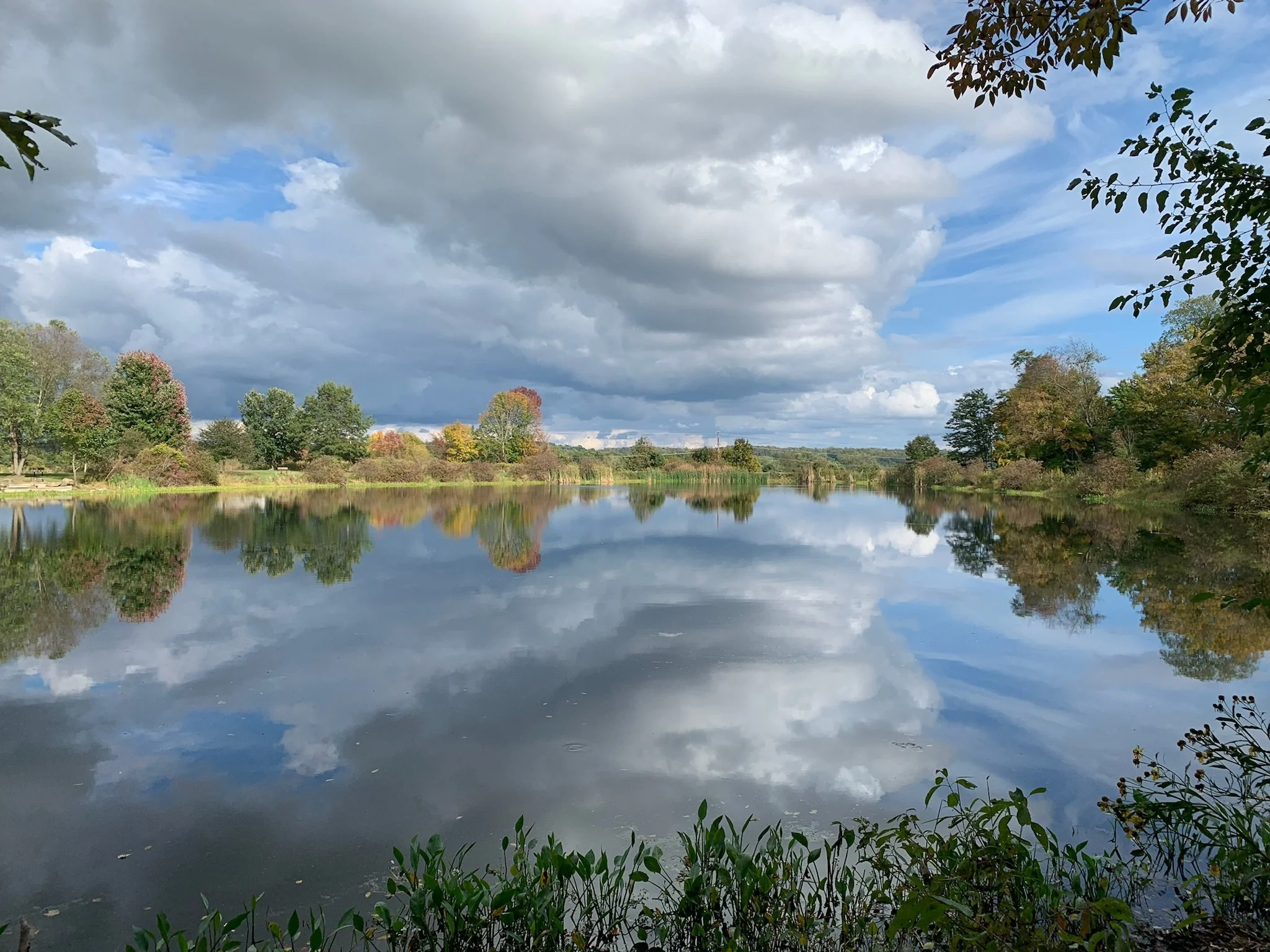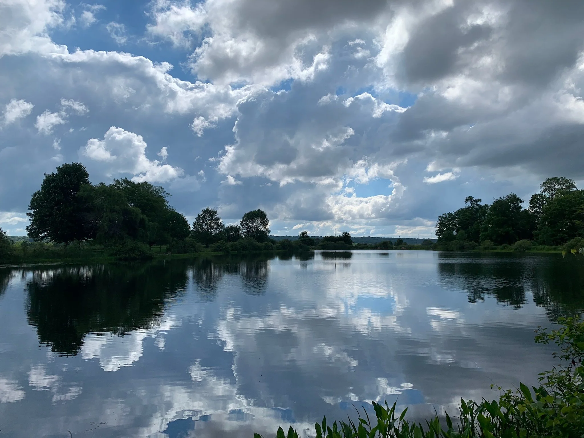 I take my dog for a walk at a lovely pond encircled by a trail almost everyday. Recently I have been captivated by the reflections of the sky in the water, inspiring me to experiment with orientation in my work. These paintings can be viewed right-side up, upside-down and even vertically like a Rorschach Ink Blot. Animal and human forms can often be spotted in the clouds, reflections and vegetation without adhering to perfect symmetry.